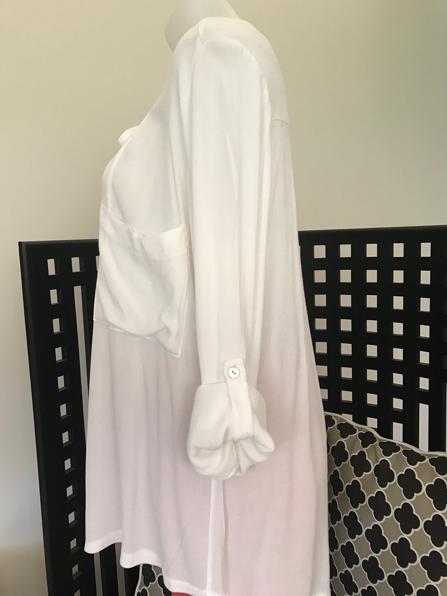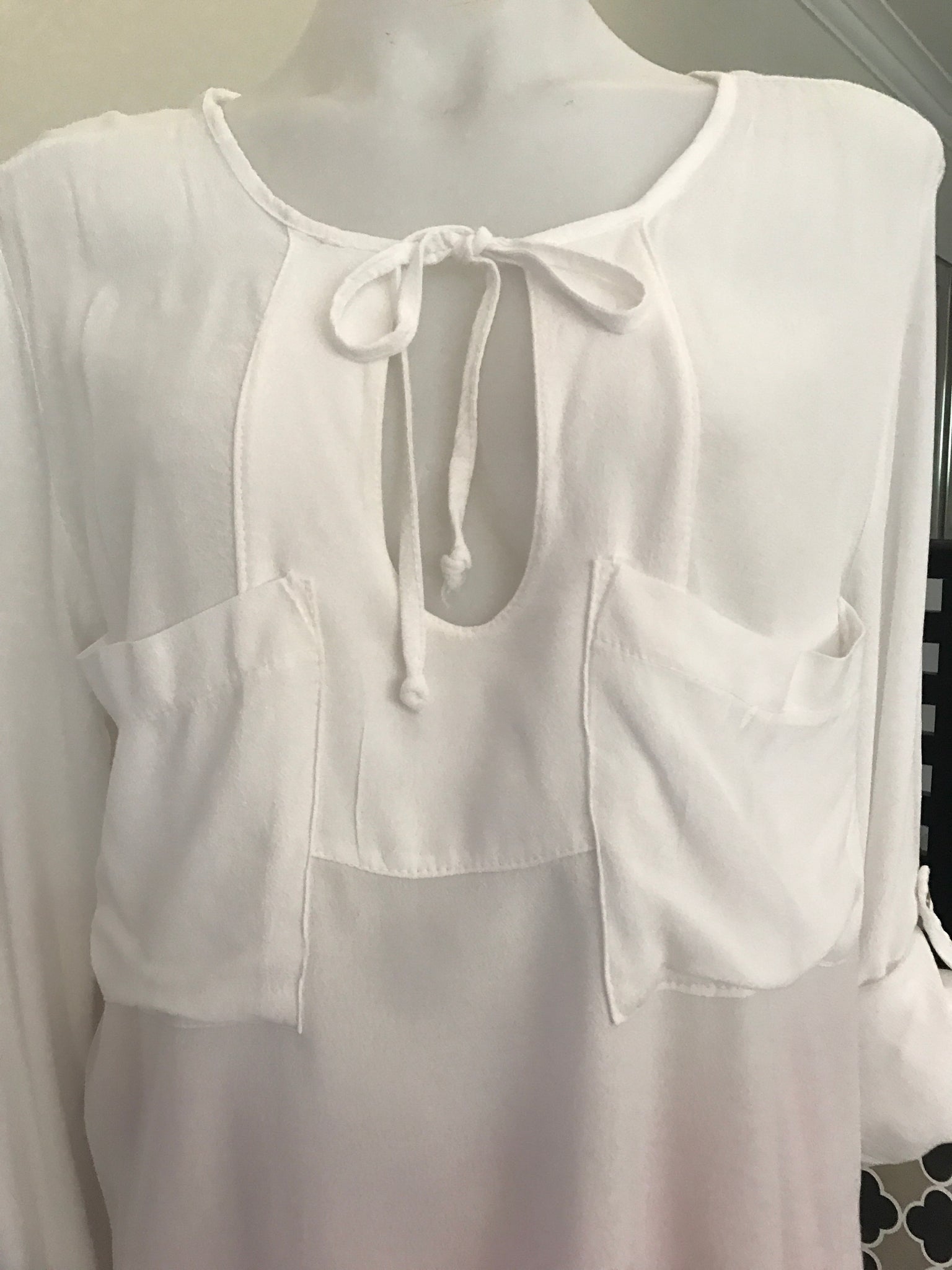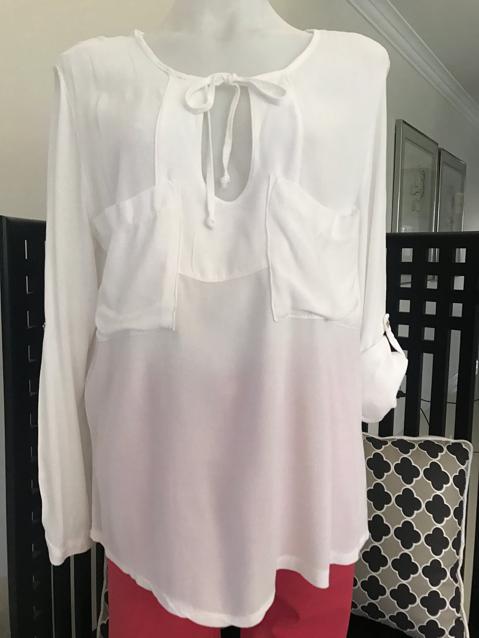 Made in Italy white tunic top features front pockets, keyhole tie front, casual loose fit and turn up long sleeves.