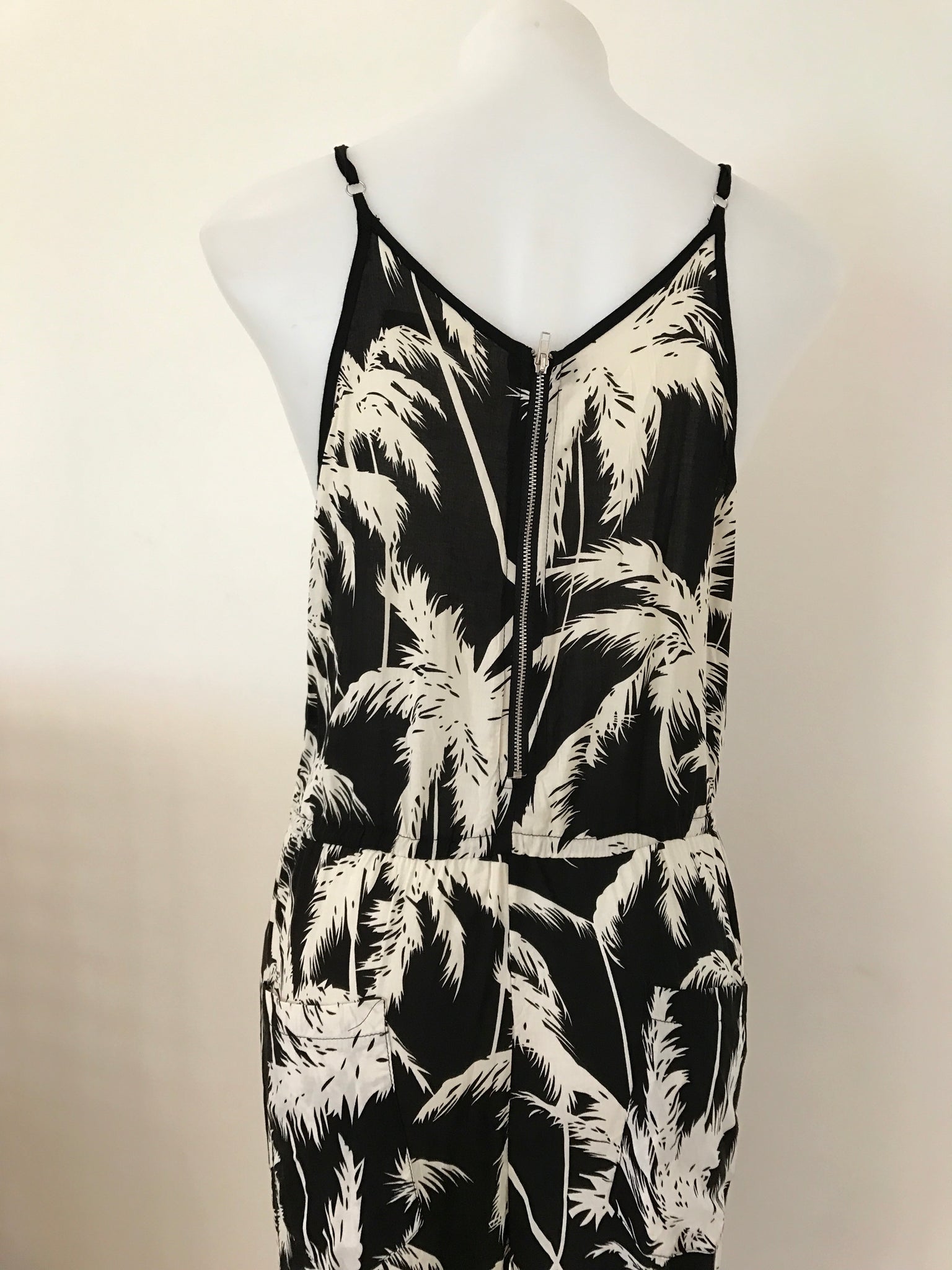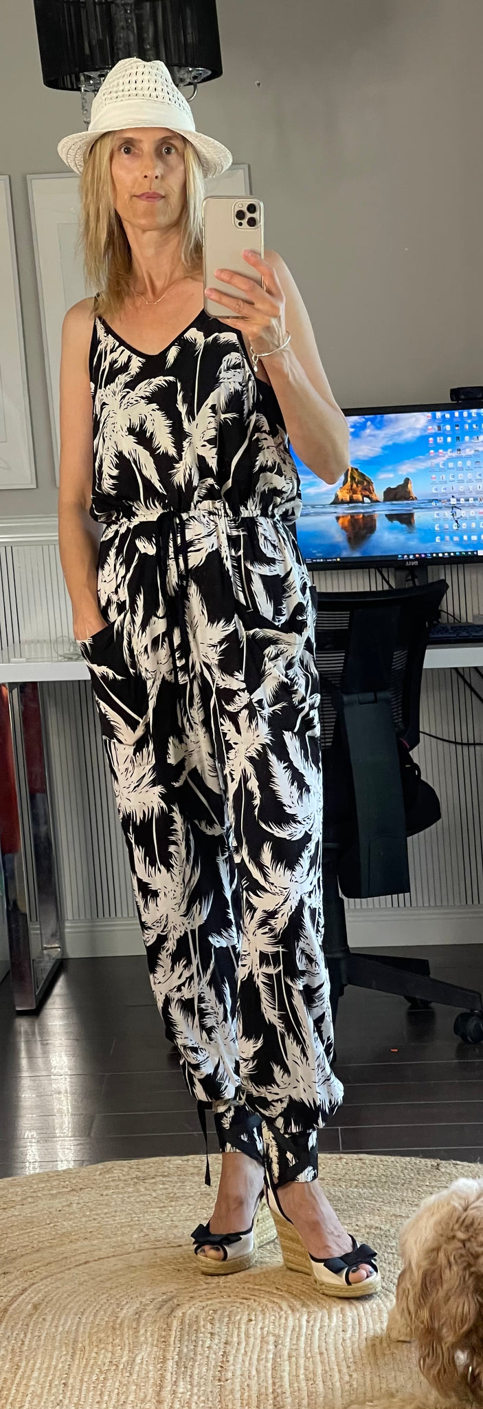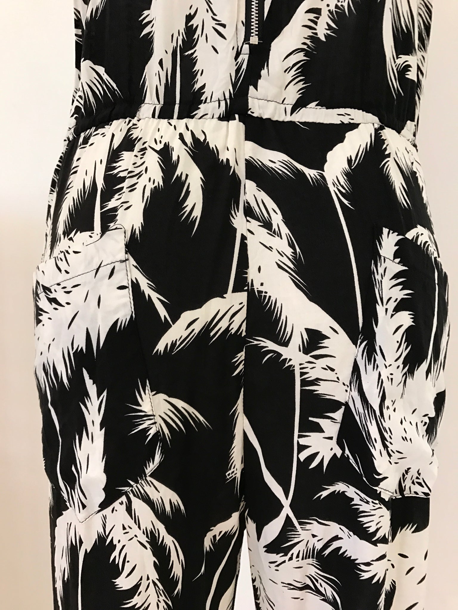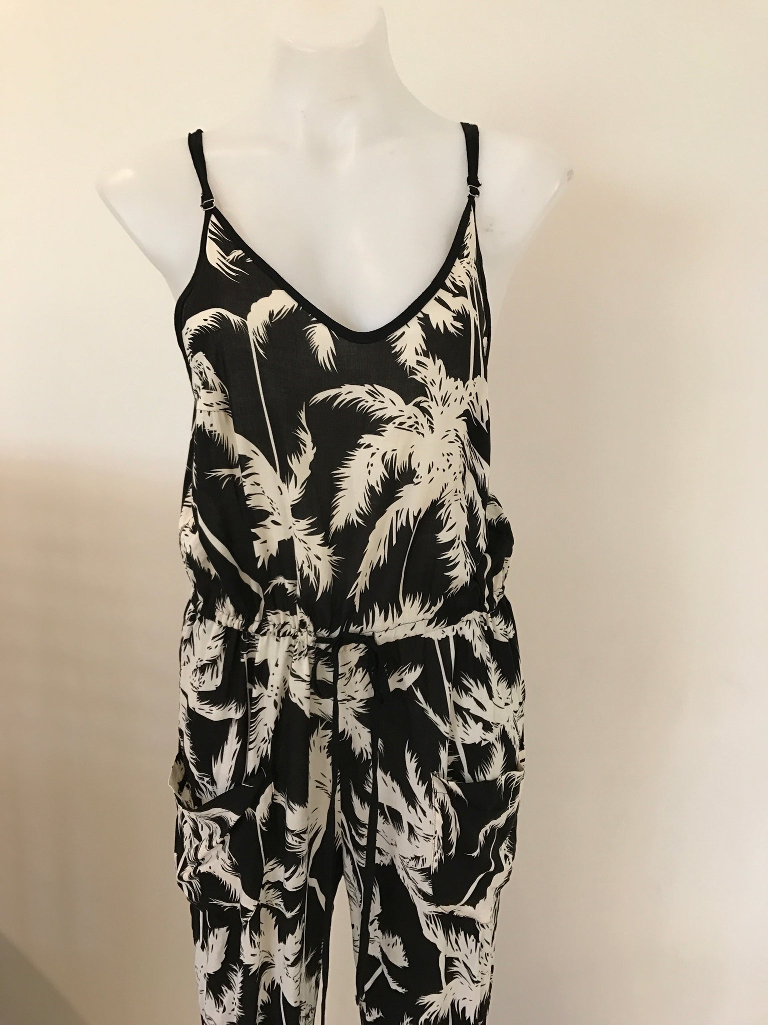 Featuring adjustable straps, v-neck, drawstring Waist, front and back pockets, exposed back metal zip, elastic cuffs and a breezy palm tree print.