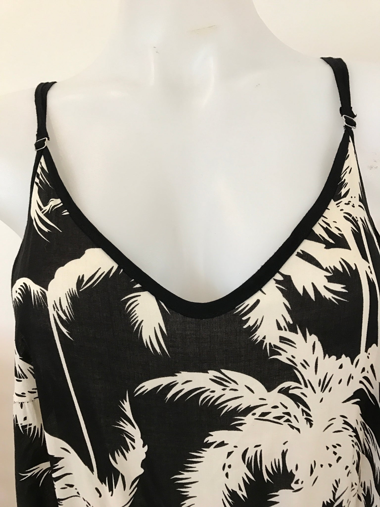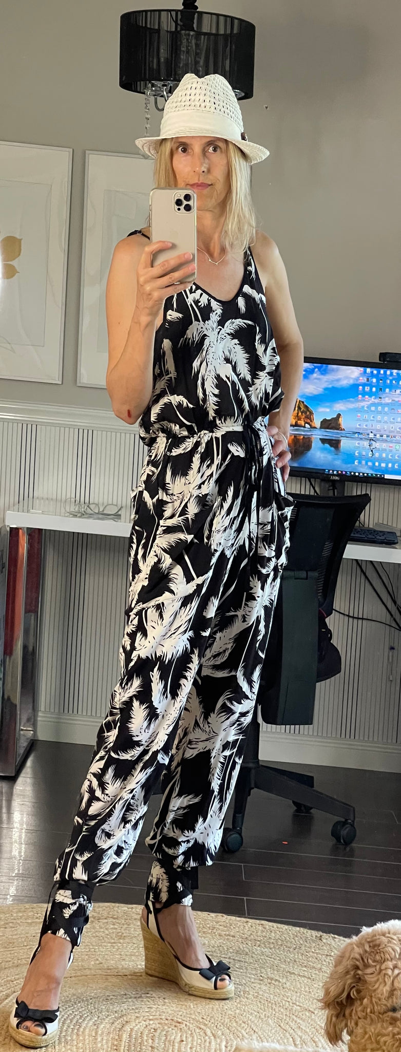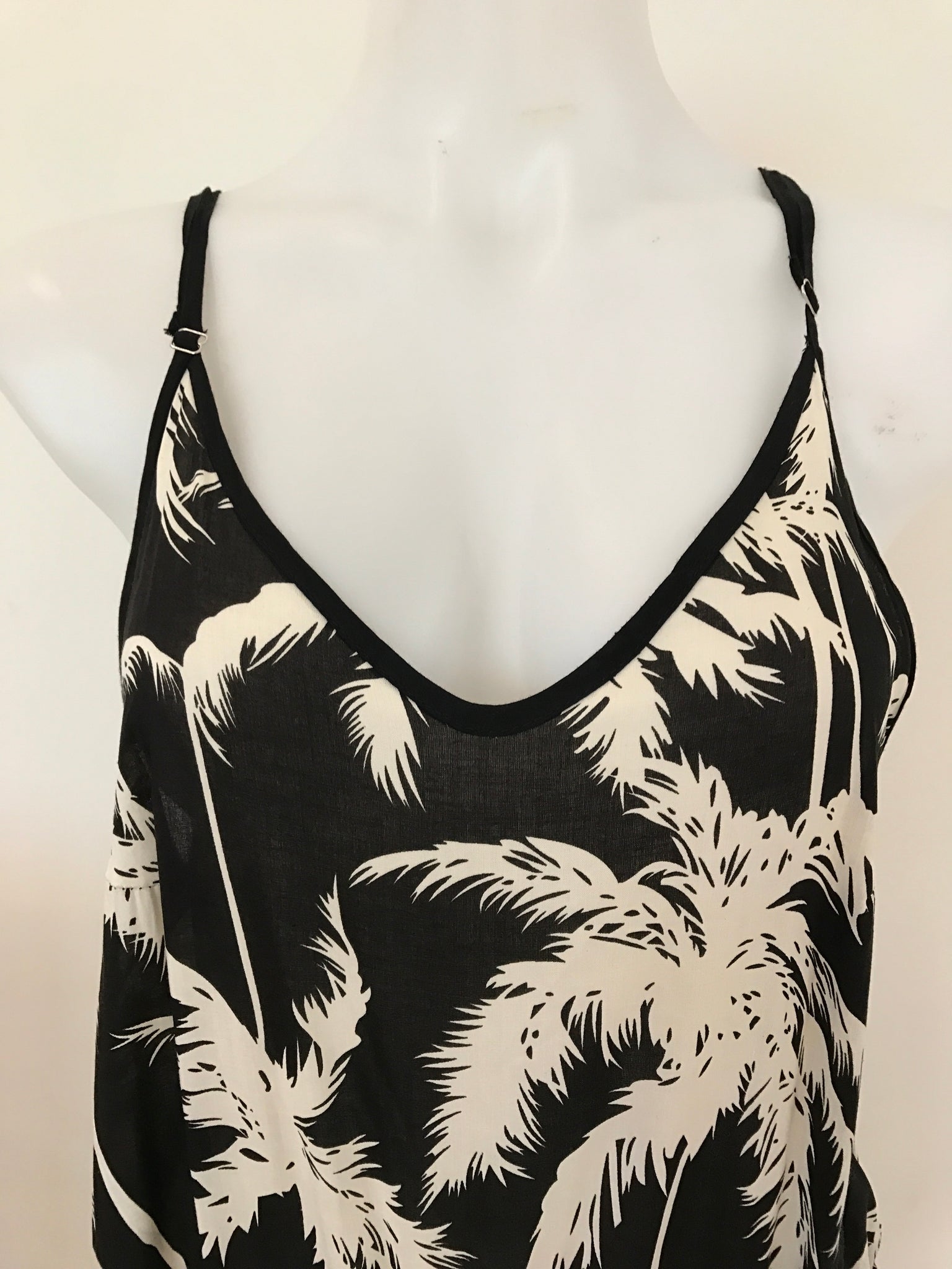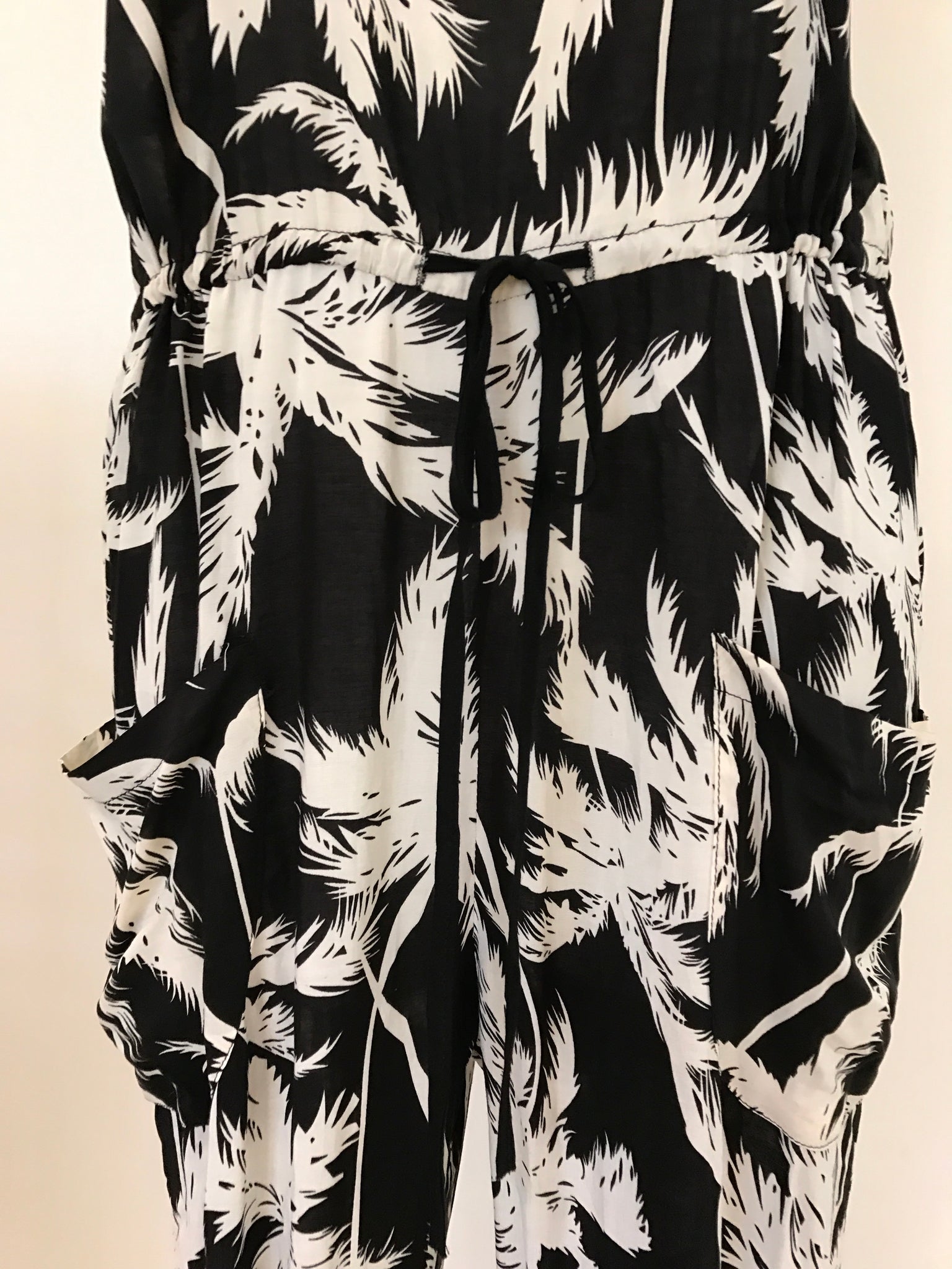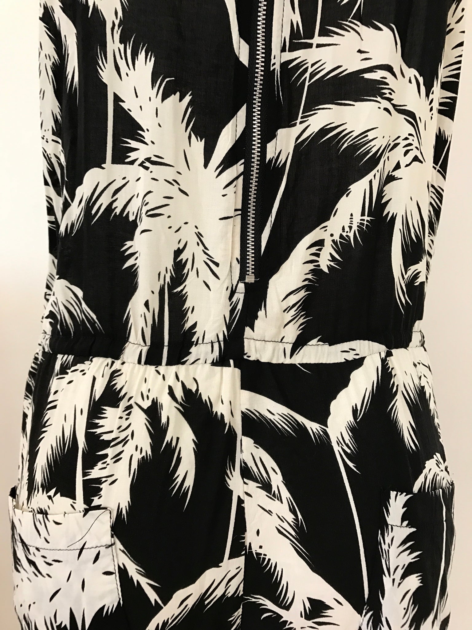 Featuring adjustable straps, v-neck, drawstring Waist, front and back pockets, exposed back metal zip, elastic cuffs and a breezy palm tree print.