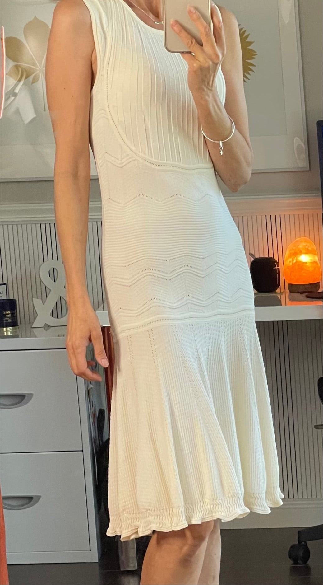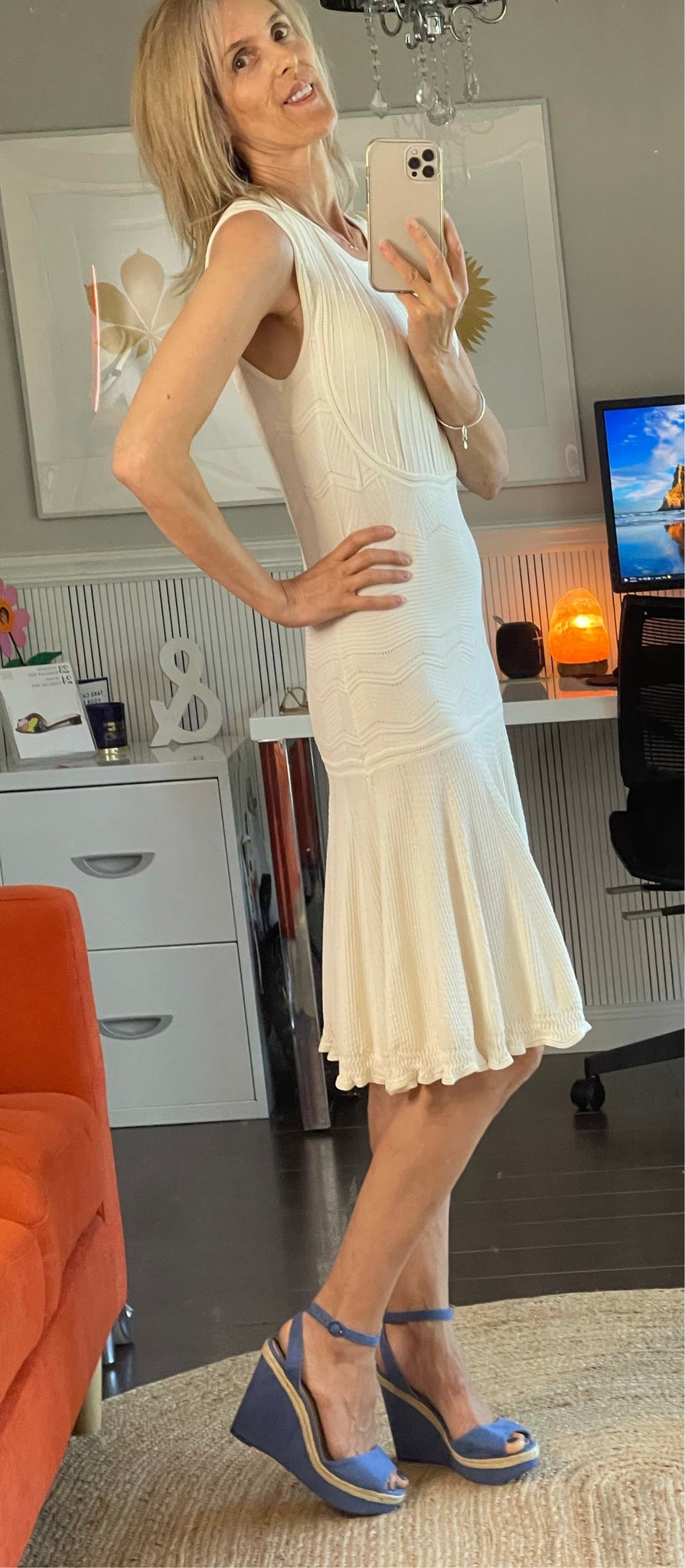 Gorgeous crochet knitted silk cotton blend sleeveless dress features a bib front and drop waist with fluted hem. Length is mid calf.