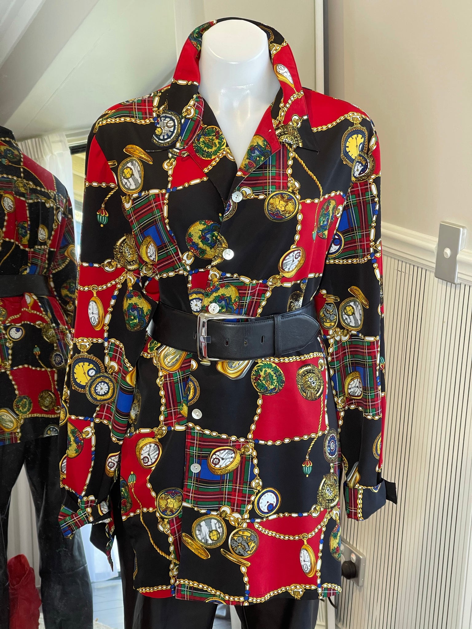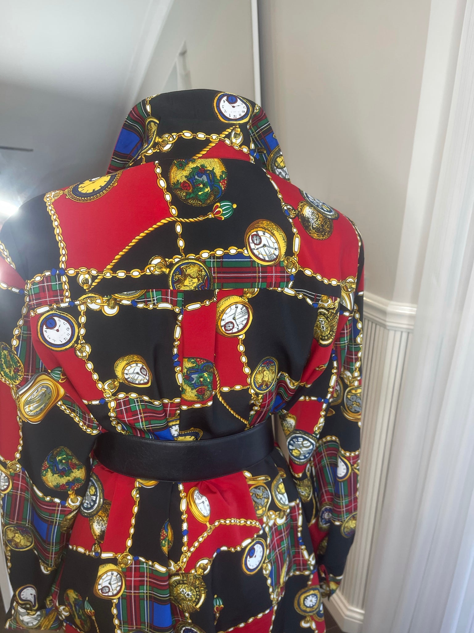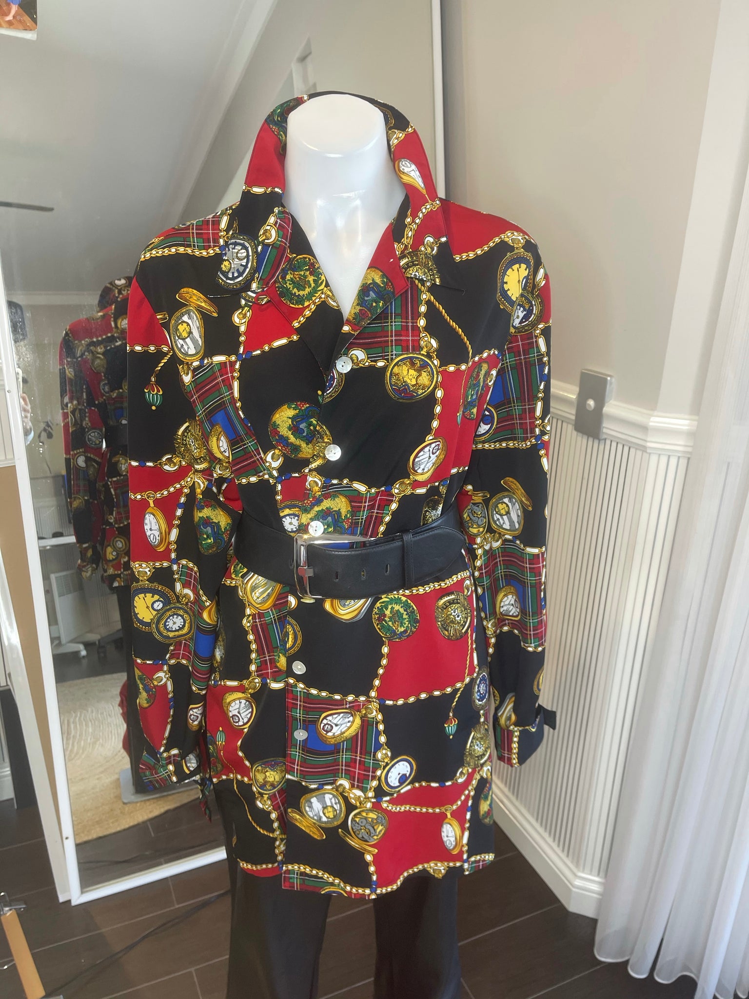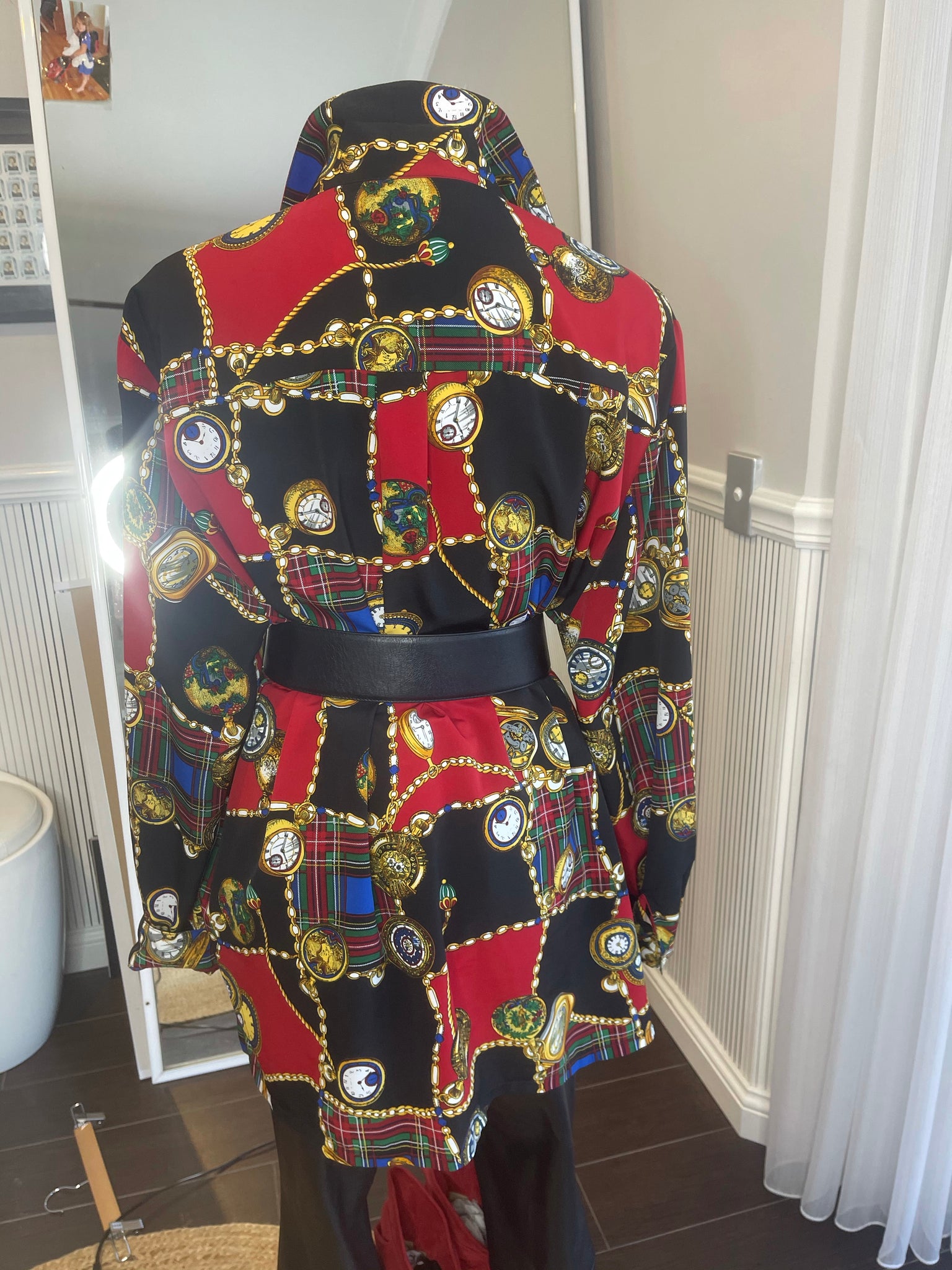 This stunning Susan Blake Versace inspired shirt is a box style with side slits, long sleeves, and lapel collar. Lapel collar has button loop so you can wear buttoned for more conservative look.
