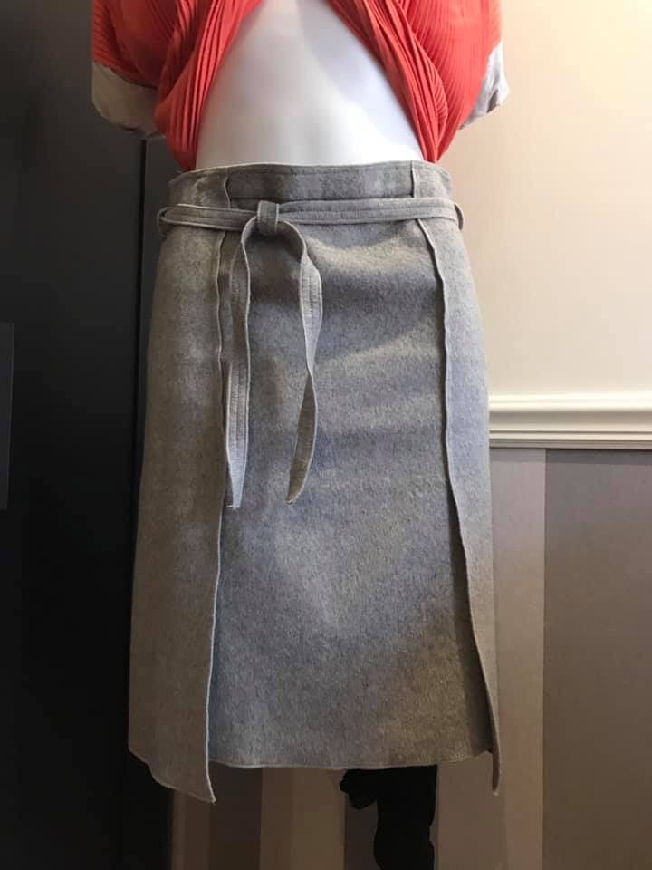 Classic knee length wool blend A-Line skirt in grey features a beautiful tie belt detail at the waist, 2 front slits and embellished seams.