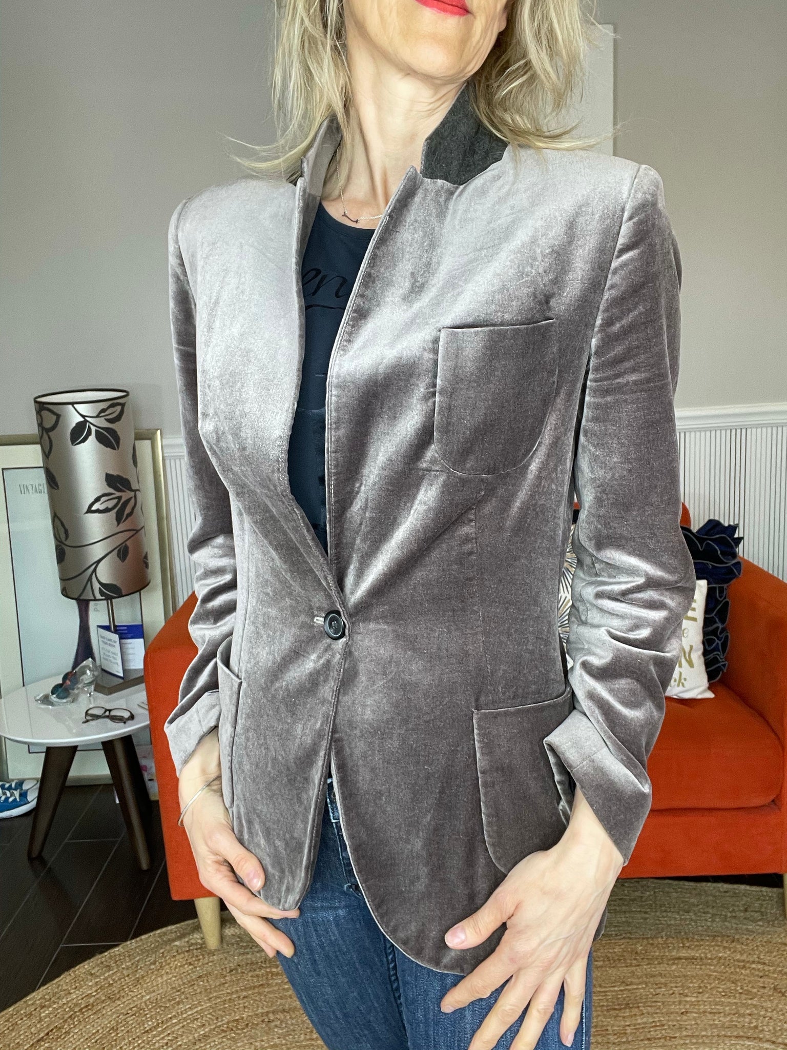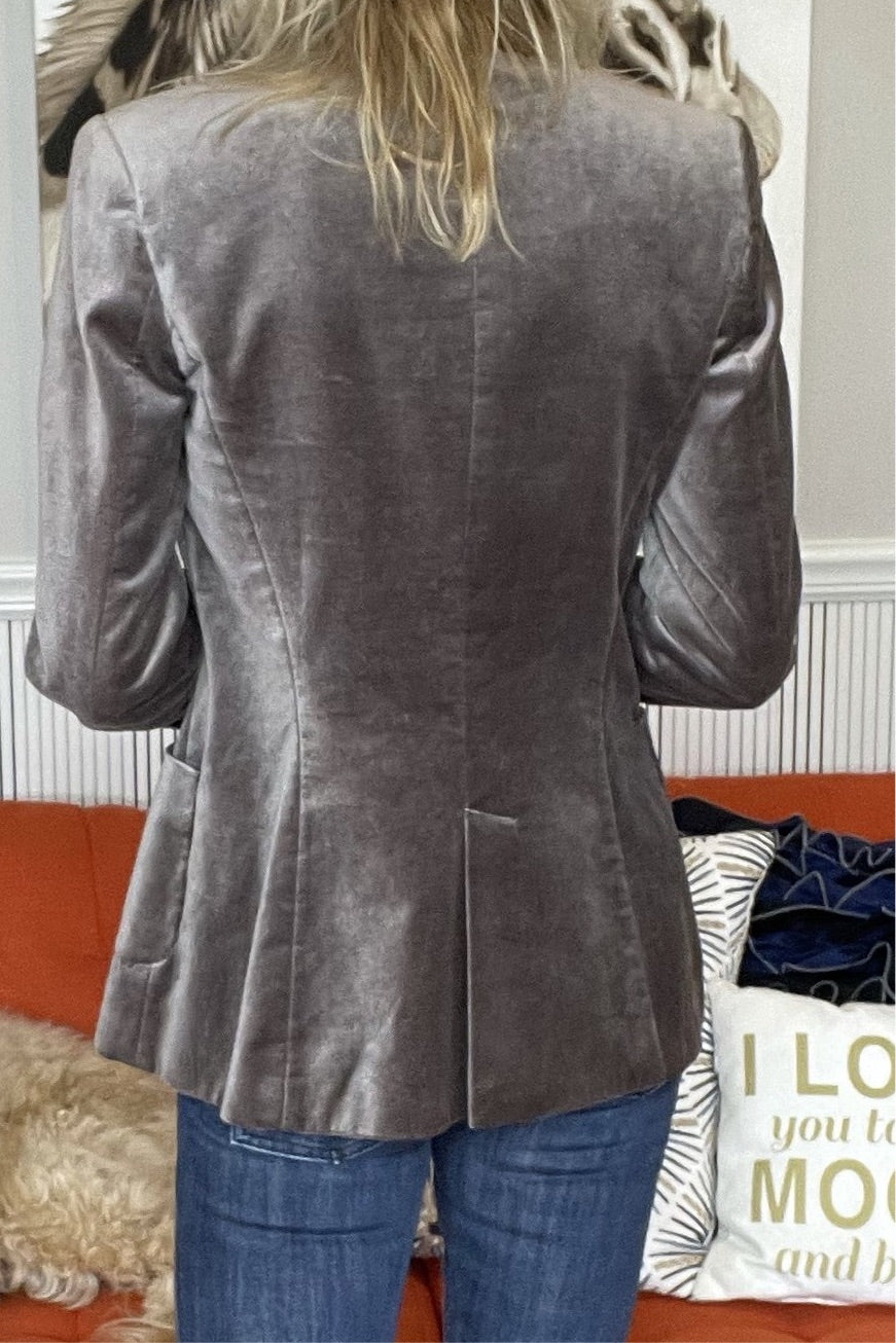Fabulous single breasted fitted velour/velvet jacket by Zara has lapel collar, single button, slit front pockets, breast pocket and back slit.