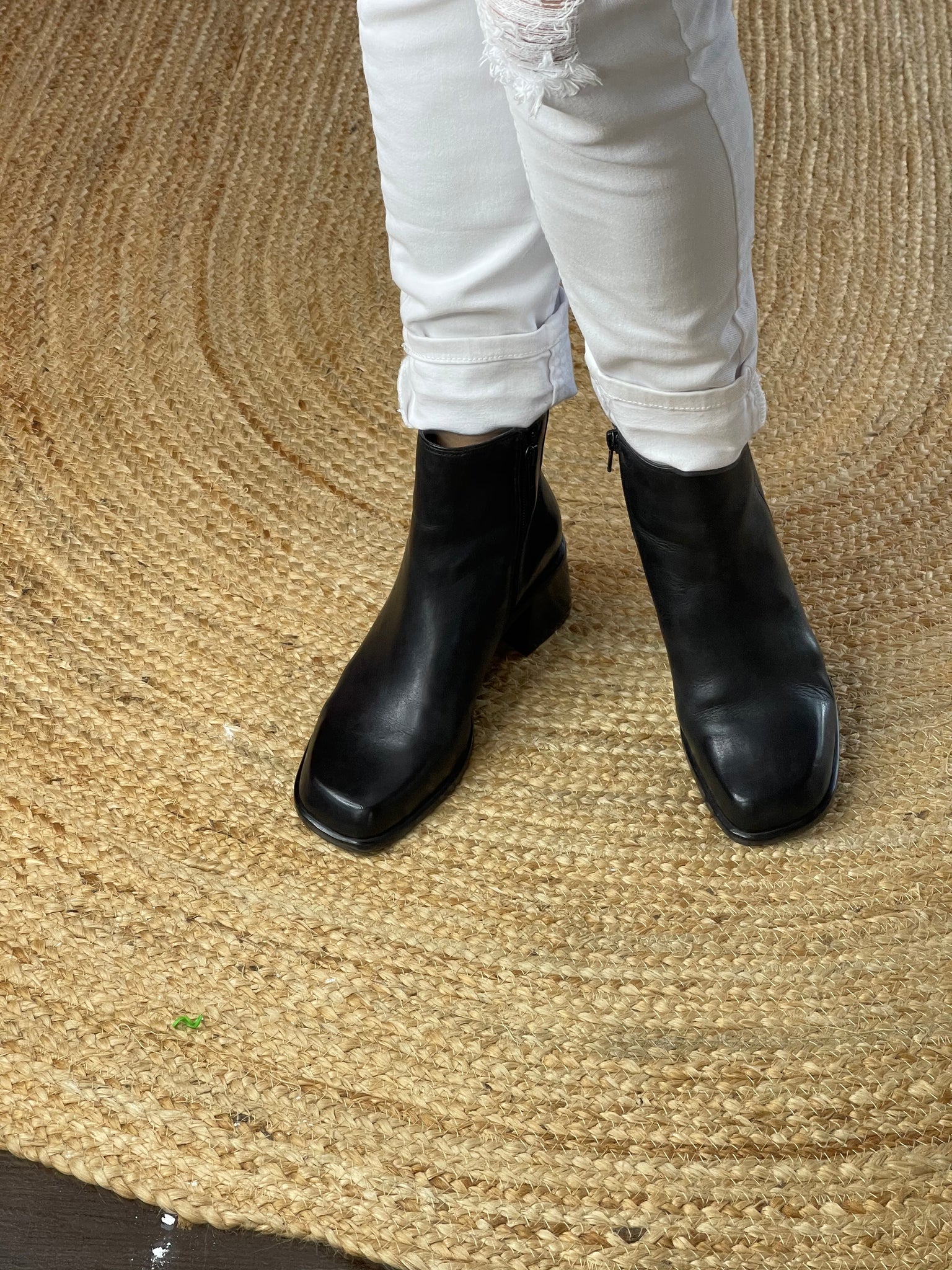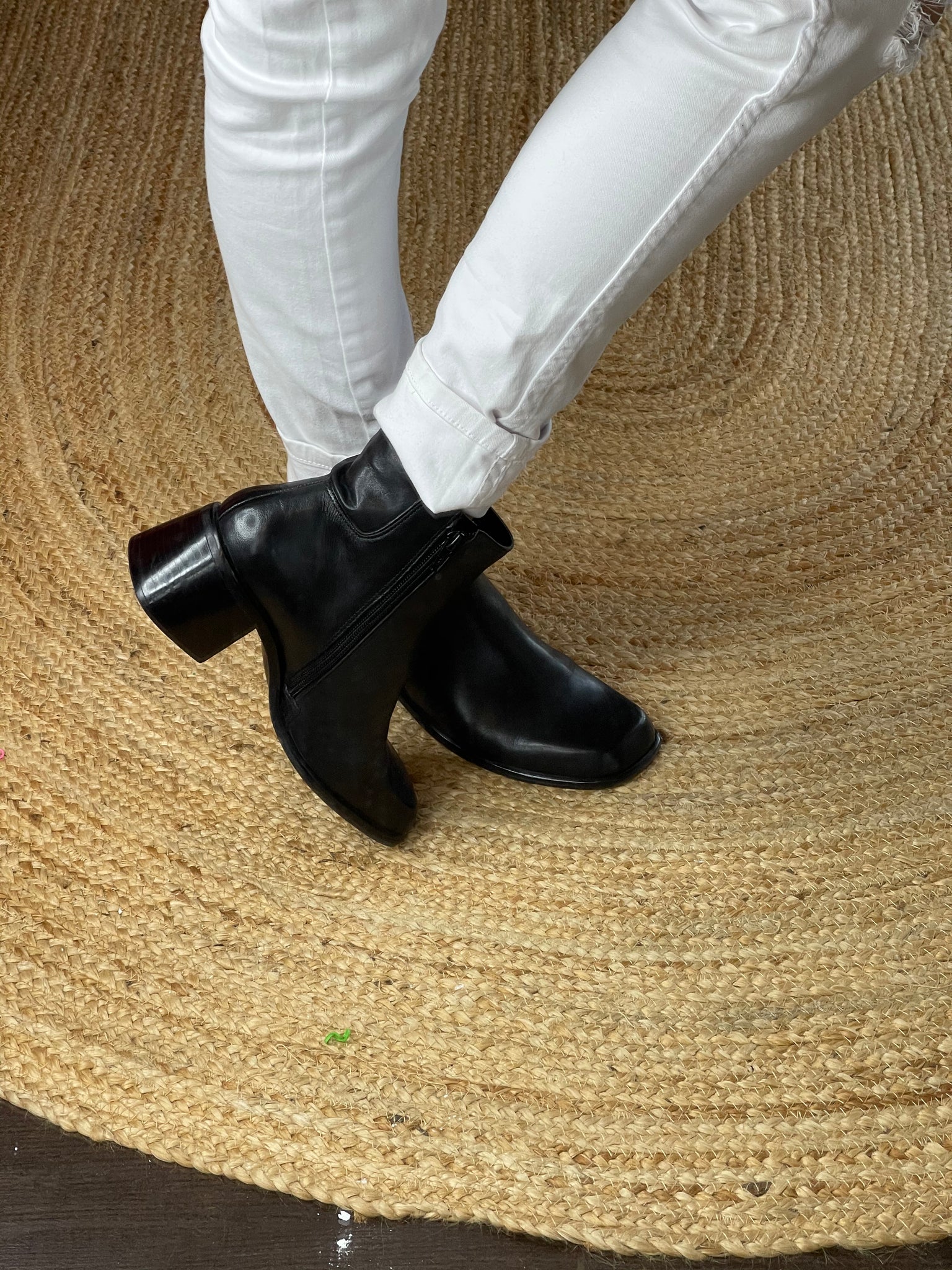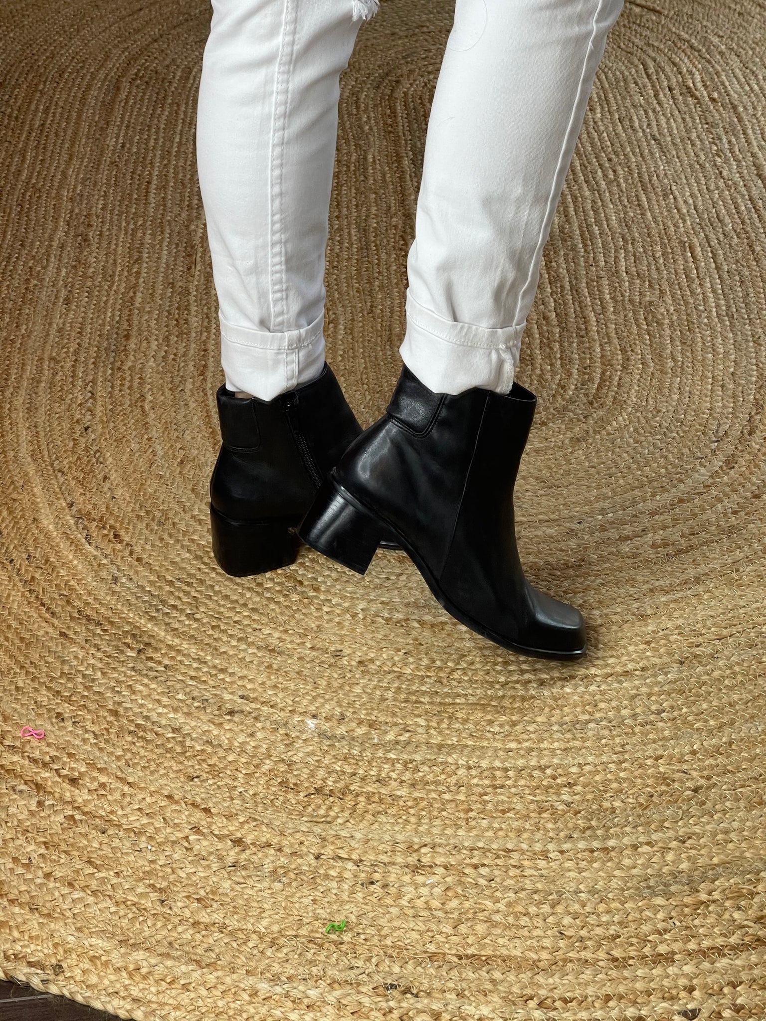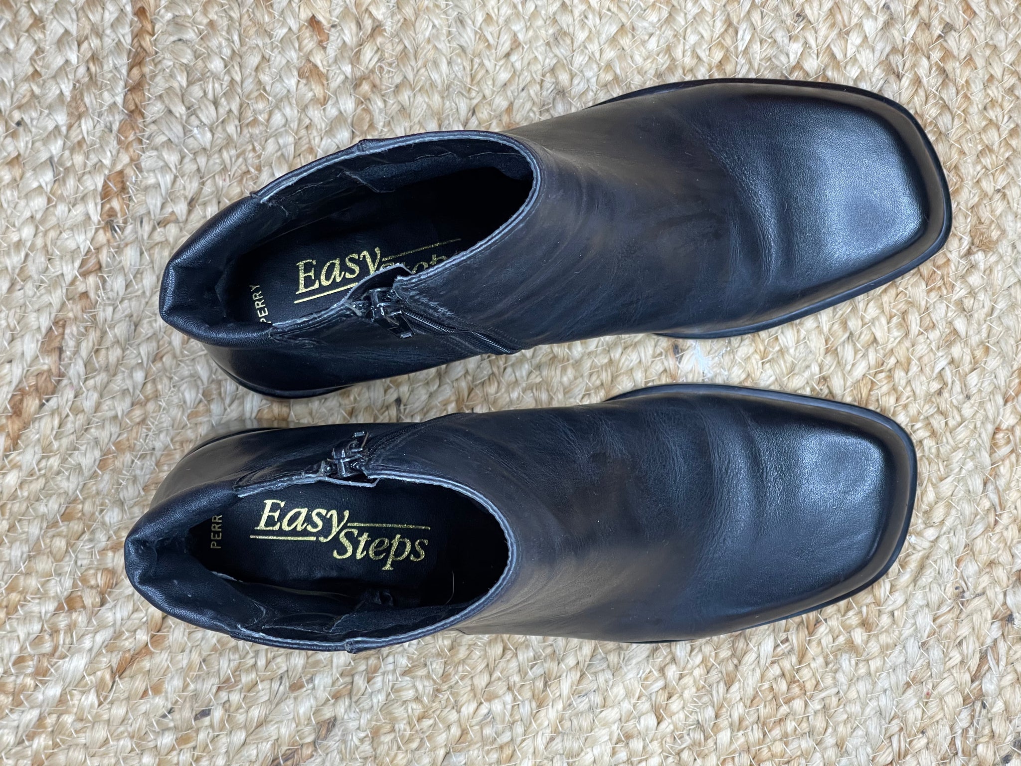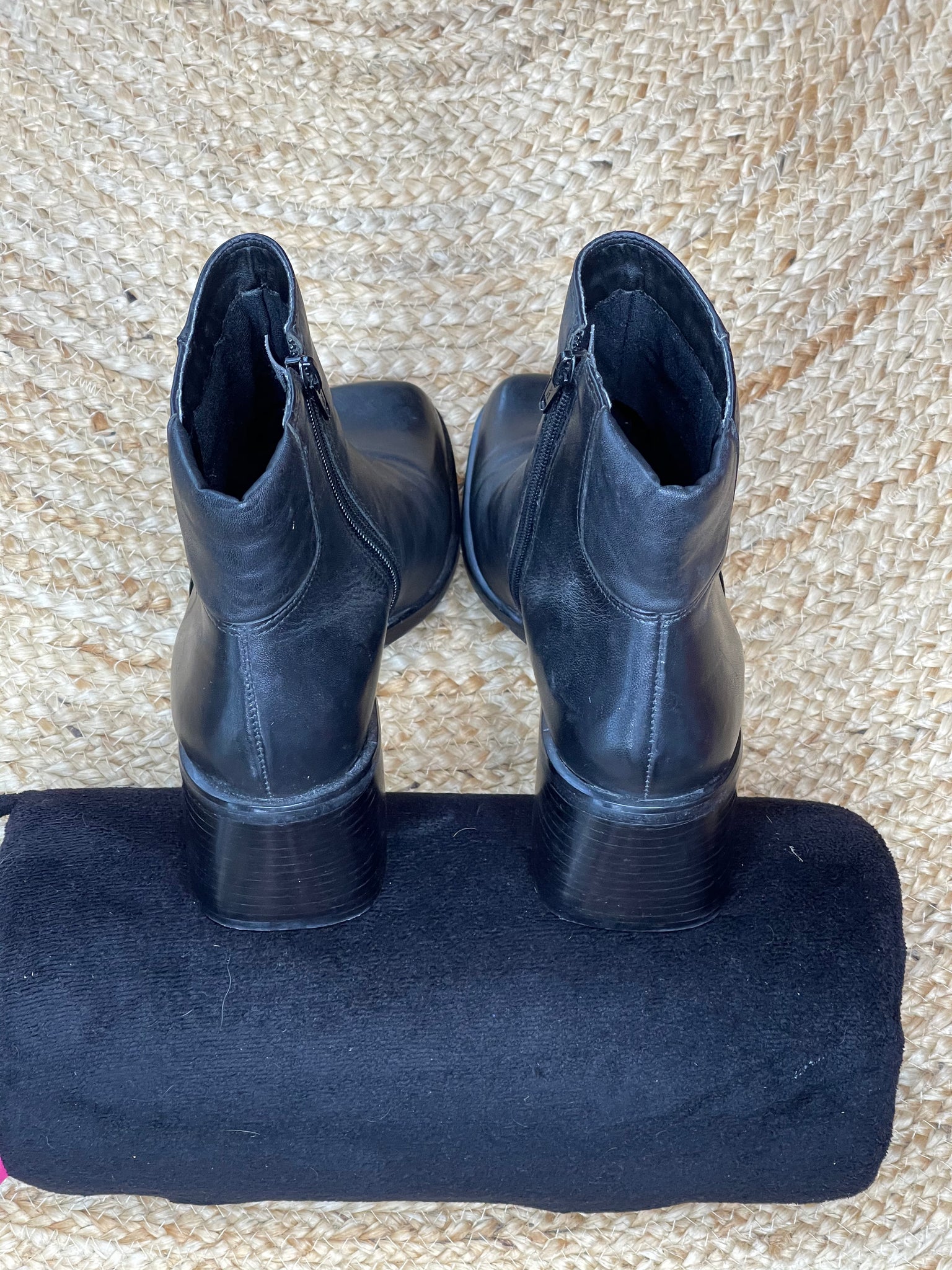 These fabulous barely worn black ankle boots from Easy Steps have a fine leather upper, feature a side zip, non slip grip and sit on a 5 cm stacked block heel.